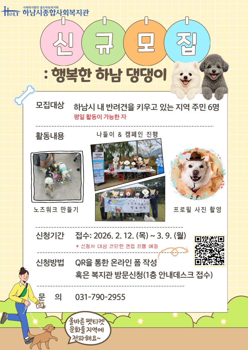 하남시 모든 지역 주민이 강아지와 함께 할 수 있는 복지 환경 조성을 위해 반려문화(펫티켓)에 대해 알아보고,