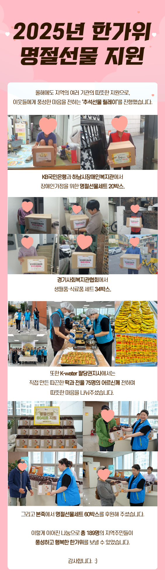 마음의 정원 9월 활동 진행 2025-10-02 조회수 153 2025 가족체험행사 '한가위 강정만들기' 2025-10-01 조회수 392 2025 한가위 명절 선물 릴레이 2025-10-01 조회수 211 하남시종합사회복지관 찾아가는 주민교육 프로그램 '성장하남' 진행(9월) 2025-10-01 조회수 170 따뜻함을 나누는 봉사단: 가을 나들이 2025-09-30 조회수 189 사례관리 팀스터디 5회기 실시 2025-09-29 조회수 99 2025년 사람과 사람 사이를 잇다 ‘사이사이’ 정서지원 원예활동 2025-09-25 조회수 222 2025년 LH하남권 주거복지지사와 함께 하는 취약계층 식품키트 지원 2025-09-25 조회수 274 청장년 1인 가구 밥상지원 ‘같이혼밥’ 대면교육(12기) 2025-09-24 조회수 120